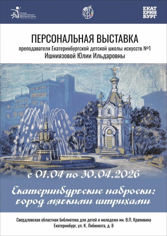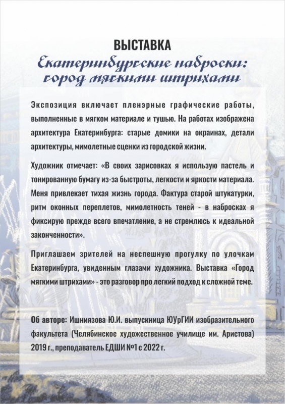 С 1 апреля в Крапивинке можно познакомиться с работами преподавателя художественного отдела ЕДШИ №1 Юлии Ильдаровны Ишниязовой – в Малом зале открывается её персональная выставка «Екатеринбургские наброски: город мягкими штрихами».