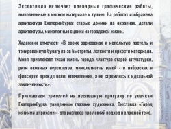 Экспозиция «Екатеринбургские наброски: город мягкими штрихами» представляет зрителям серию пленэрных графических работ, посвященных архитектурному облику Екатеринбурга. В экспозицию вошли зарисовки, выполненные разными материалами – пастелью, соусом, углем и тушью на тонированной бумаге. На выставке представлены наброски как сохранившихся старинных деревянных домов, так и элементы современной архитектуры.
