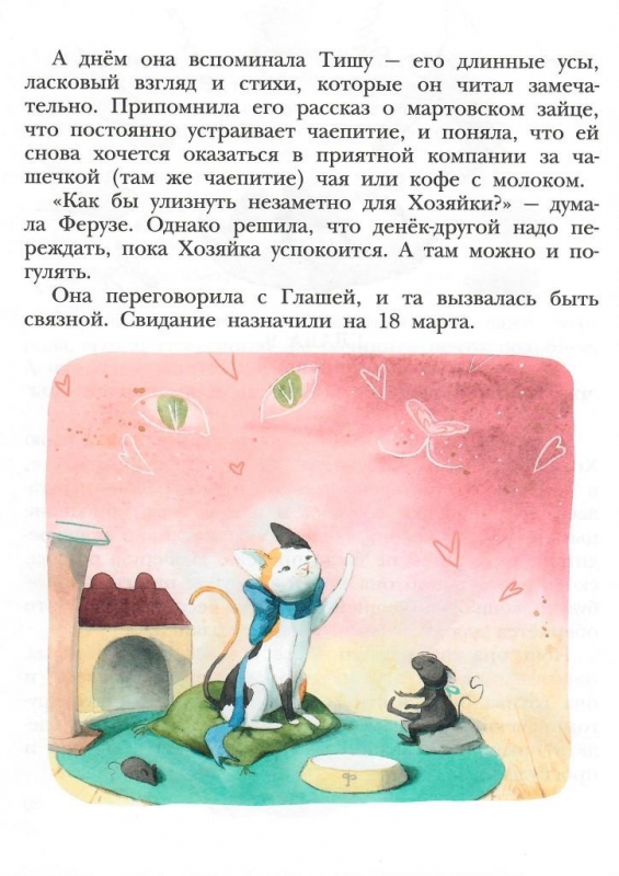 Ферузе – настоящая домашняя кошка. «Домашняя и трёхцветная, а это означало, что само её присутствие приносило в дом счастье и не требовало никаких иных жертв или усилий с её стороны». Ферузе очень любила свою хозяйку, а особенно когда та читала книги. И вот однажды после завтрака домашняя кошка решила исследовать окрестности квартиры. Она была удивлена, обнаружив за мусорным ведром отверстие, Ферузе расширила проход и юркнула в новое пространство. Перед ней предстала уникальная картина – читающая мышь. Да-да! Самая настоящая читающая мышь! Но как отреагировала мышь на столь неожиданное появление кошки? Она отложила книгу в сторону и отправилась на свою маленькую кухню разогревать обед.