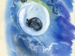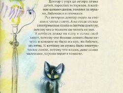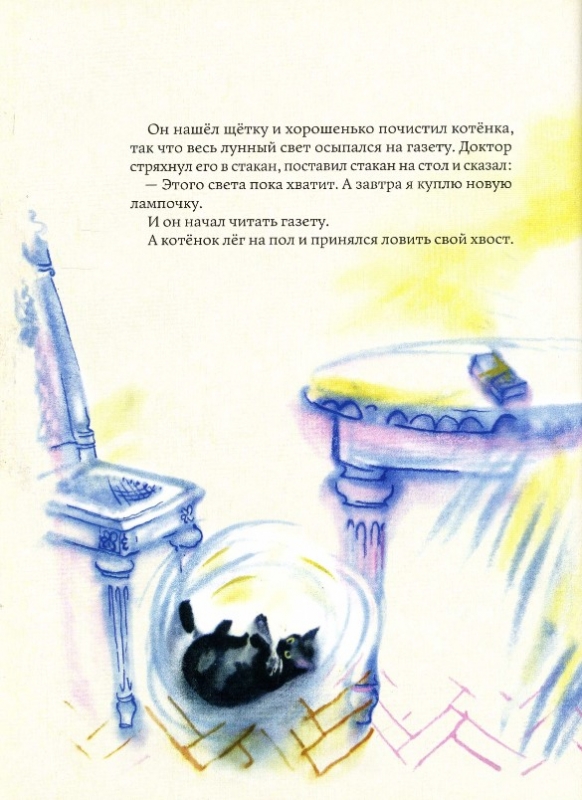 История очень проста и понятна детям. Маленький и полностью чёрный котёнок волшебным образом оказывается на Луне, а потом, так же невероятно, возвращается к своему хозяину – старому доктору.