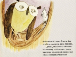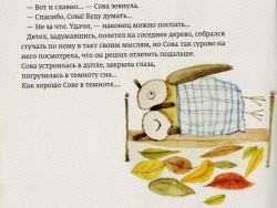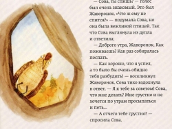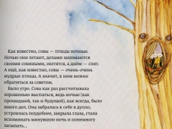 Вам нравятся совы? Нам очень! И когда видишь на обложке книги изображение необычной совы – сразу хочется открыть её, а открыв, просто влюбляешься и в книгу, и в сову. Да-да, посудите сами! Кто из вас после ночного бдения (совы ведь ночью летают, занимаются своими совиными делами, охотятся, а днём спят), только-только прикоснувшись к подушке головой и услышав вопрос «Сова, ты спишь?», станет разговаривать с гостем? Ну, ещё один раз можно ответить. Но когда это продолжается в течении всего дня, то просто удивляешься совиному терпению. А какие советы она даёт! Не напрасно совы считаются очень мудрыми птицами. Но наша сова не только мудрая, она – настоящий психолог! Советы, которые она давала Жаворонку, Дятлу, Белке, Курочке, Мышонку, Медведю и Ёжику просто восхищают своей простотой и изяществом.