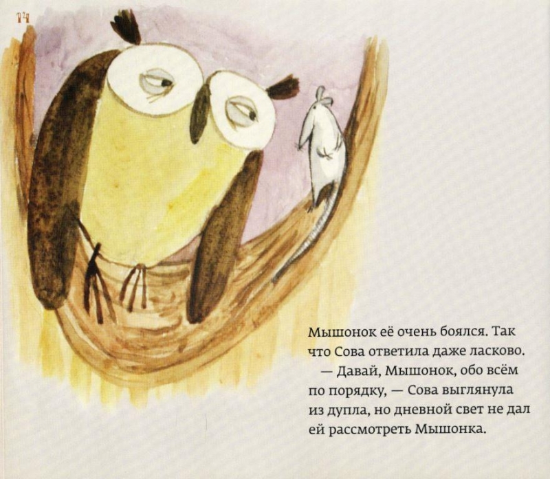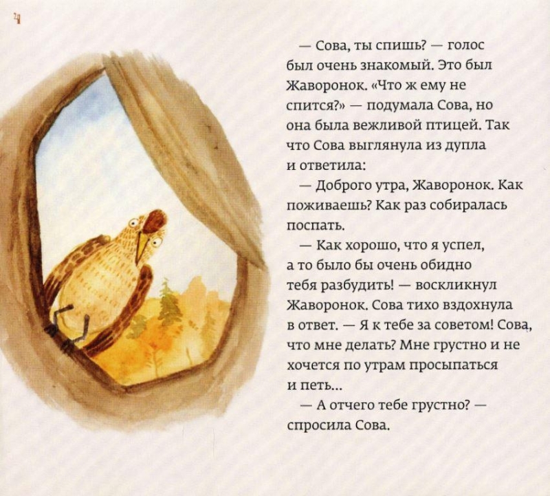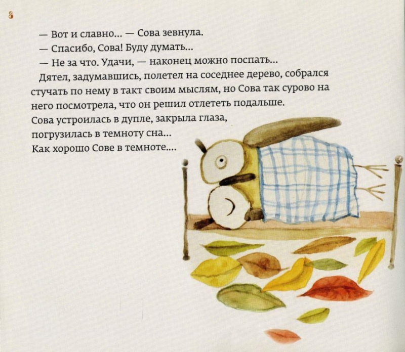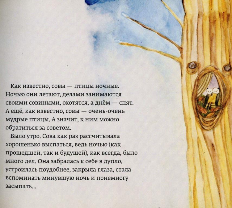 Вам нравятся совы? Нам очень! И когда видишь на обложке книги изображение необычной совы – сразу хочется открыть её, а открыв, просто влюбляешься и в книгу, и в сову. Да-да, посудите сами! Кто из вас после ночного бдения (совы ведь ночью летают, занимаются своими совиными делами, охотятся, а днём спят), только-только прикоснувшись к подушке головой и услышав вопрос «Сова, ты спишь?», станет разговаривать с гостем? Ну, ещё один раз можно ответить. Но когда это продолжается в течении всего дня, то просто удивляешься совиному терпению. А какие советы она даёт! Не напрасно совы считаются очень мудрыми птицами. Но наша сова не только мудрая, она – настоящий психолог! Советы, которые она давала Жаворонку, Дятлу, Белке, Курочке, Мышонку, Медведю и Ёжику просто восхищают своей простотой и изяществом.