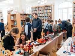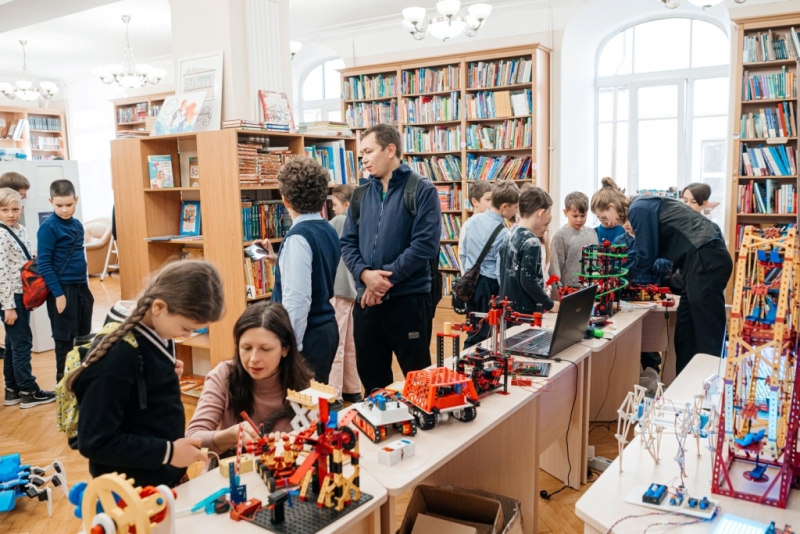 В течение всего дня на абонементе Крапивинки работала выставка «Экспериментальная механика и робототехника» под руководством Евгения Юрьевича Калинина. Посетители могли увидеть роботов с моторчиками, колесами, лампочками, которые крутились, жужжали и мигали, умели рисовать и передвигаться, а также все желающие смогли сделать памятное фото в специальной фотозоне.