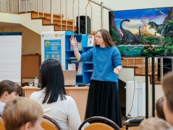 В Малом зале царила особая атмосфера, где монтессори-педагог Ярослава Никонова заставила науку звучать. В музыкальном формате дети легко запоминали сложные темы: эволюцию мира, динозавров и происхождение человека.