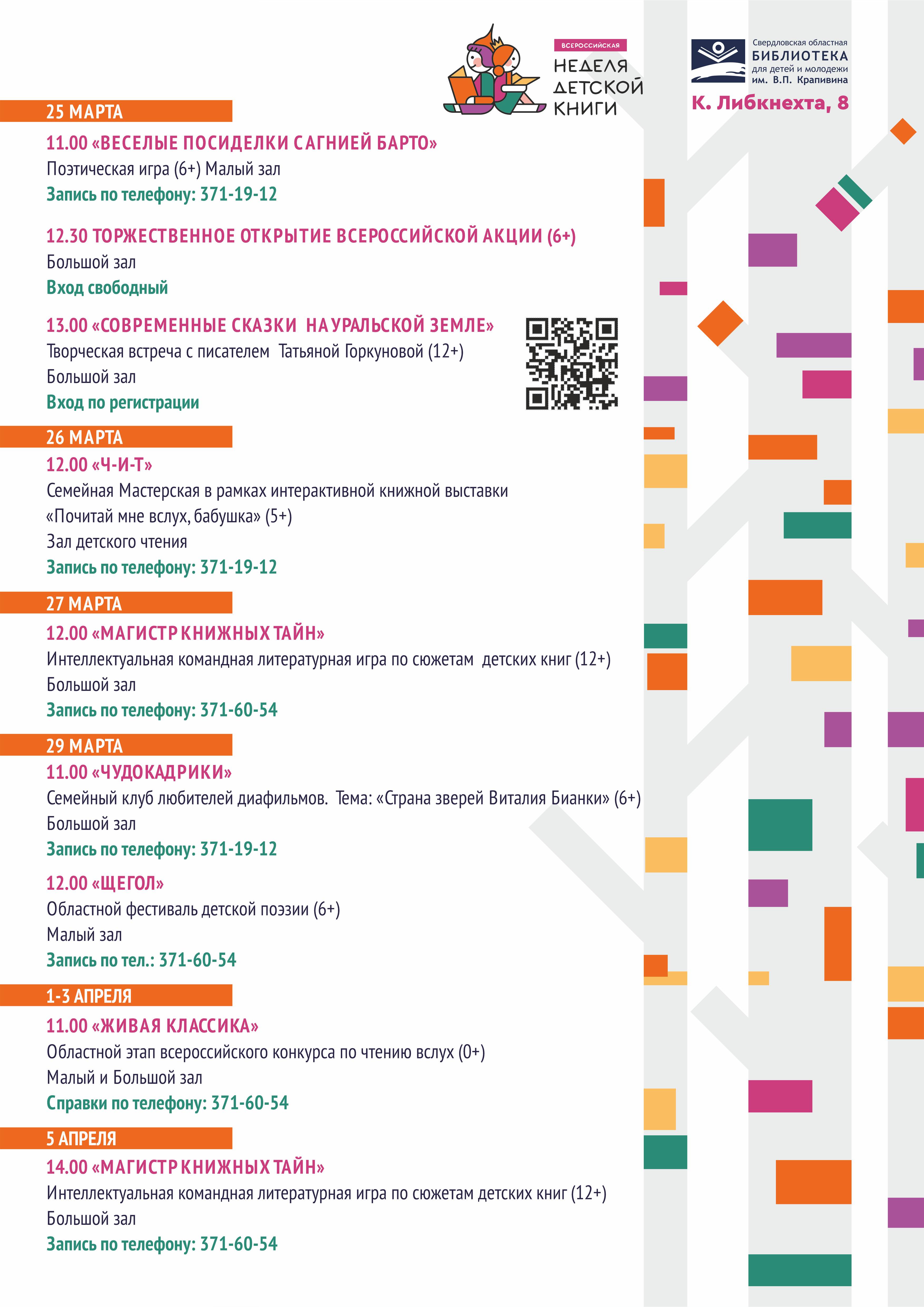 25 марта в 12.30 в Большом зале Крапивинки состоится торжественное открытие «Недели детской книги», в котором примут участие ученики Детской музыкальной школы № 11 им. М. А. Балакирева. А в 13.00 начнётся творческая встреча с известной уральской писательницей Татьяной Горкуновой. В тот же день любители детской поэзии смогут присоединиться к «Веселым посиделкам с Агнией Барто»: будем читать, играть и мастерить.