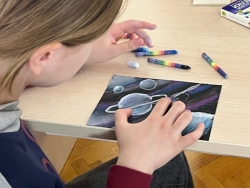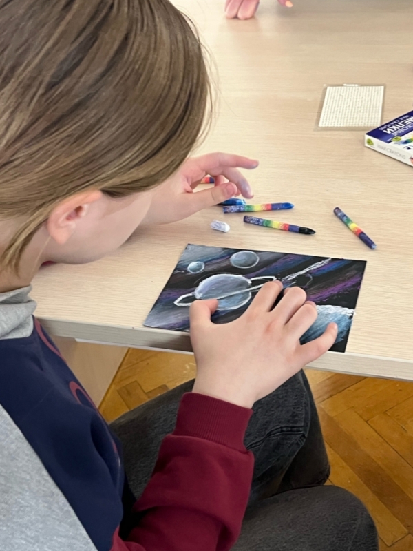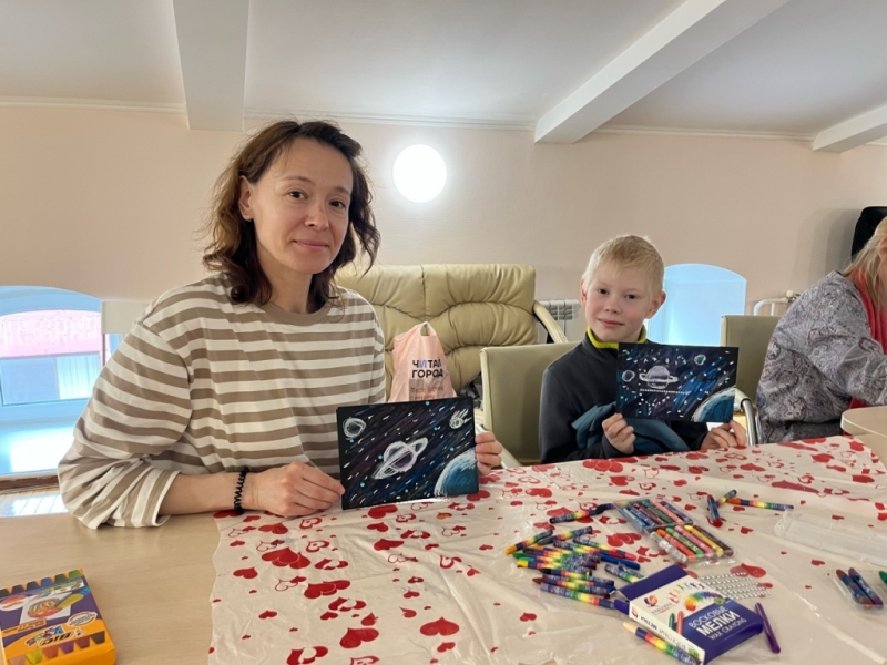 Чуть позже в уютном Камерном зале состоялся семейный художественный мастер-класс «Космос». Участники рисовали свою галактику с планетами и звёздами. Дети научились правильно выстраивать композицию на листе и освоили технику рисования цветными мелками на чёрной бумаге.