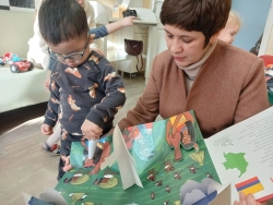 На этом сказочная атмосфера не завершилась. Перед участниками занятия развернулась целая история Эрика Карла о Мечтательном хамелеоне, легко меняющего цвет, то он становился красным, как цветок, то желтым, как песок. Ярко-зеленым, если был он сыт и доволен и серым, если нападала хандра. Но кто мы подумать, что попав в зоопарк, он захочет быть белым, как медведь, хитрым, как лиса или быстрым, как олень, а еще быть похожим на замечательных малышей, с которыми он с удовольствием ловил мух и комаров, танцевал под песню «У жирафа пятна, пятнышки везде» и изображал рыбок.