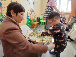 Маленькие пациенты реабилитационного центра одними из первых познакомились с книжной новинкой нашей библиотеки – 4 выпуском многоформатного обучающего комплекта «Путешествие по странам и континентам» Благотворительного фонда «Иллюстрированные книжки для маленьких слепых детей». Ребята отправились на остров Ява и вместе с волшебным карандашом слушали шум океана и индонезийскую национальную музыку, а также рассматривали объёмные, панорамные изображения, плывущих в воде рыб и осьминогов.
