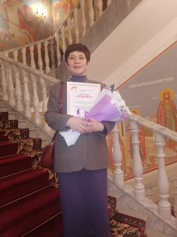 Почетное звание лауреата премии общественного признания «Спасибо!» получила Римма Гарифулловна Садыкова, заведующий сектором детского чтения Свердловской областной библиотеки для детей и молодежи имени В.П. Крапивина, за реализацию лаборатории детского чтения «Оранжевая гусеница» и инклюзивную программу «Крапивинка в чемодане».
