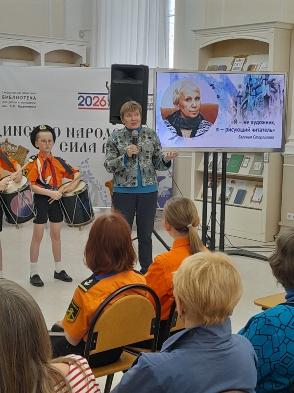 Евгения Стерлигова сотрудничала с Владиславом Петровичем больше 50 лет и проиллюстрировала практически все его произведения. В большом зале библиотеки собраны лучшие работы мастера. Сама Евгения Ивановна называет себя не художником, а «рисующим читателем» и работает гелевой ручкой, акварелью и тушью. Ее почерк невозможно спутать ни с чьим другим.